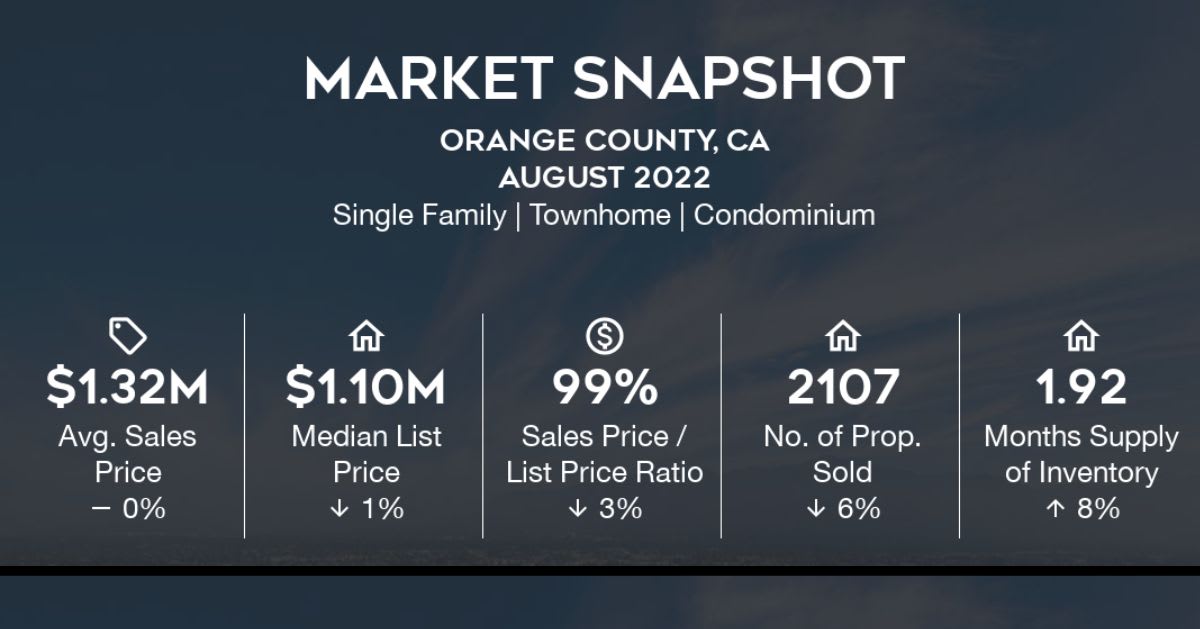 We saw an increase of inventory by 42% compared to the previous 3 months' average. The Average sales price was at $1.31M & Median List Price was at $1.09M. In the addition, the number of properties sold in August 2022 was 1844, which was down 18% from the previous month
