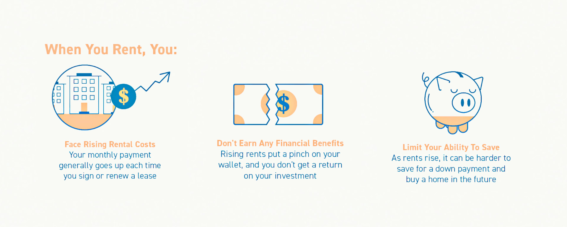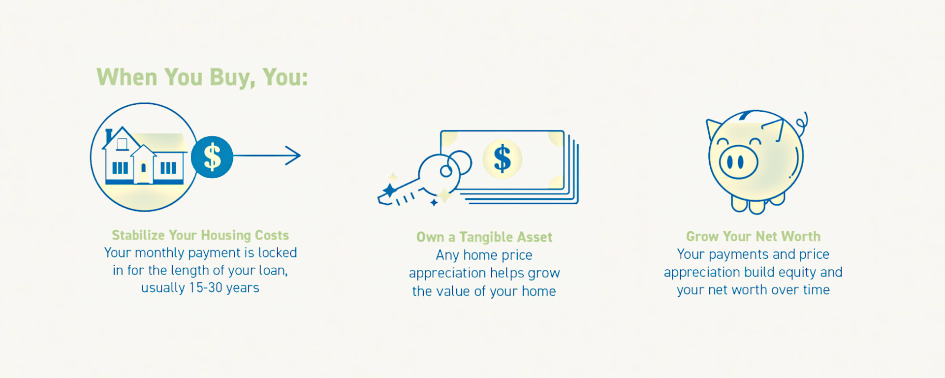 - When you buy, you can stabilize your housing costs, own a tangible asset, and grow your net worth as you gain equity. When you rent, you face rising housing costs, won’t see a return on your investment, and limit your ability to save.
