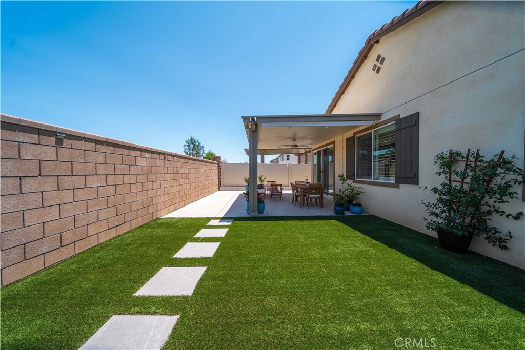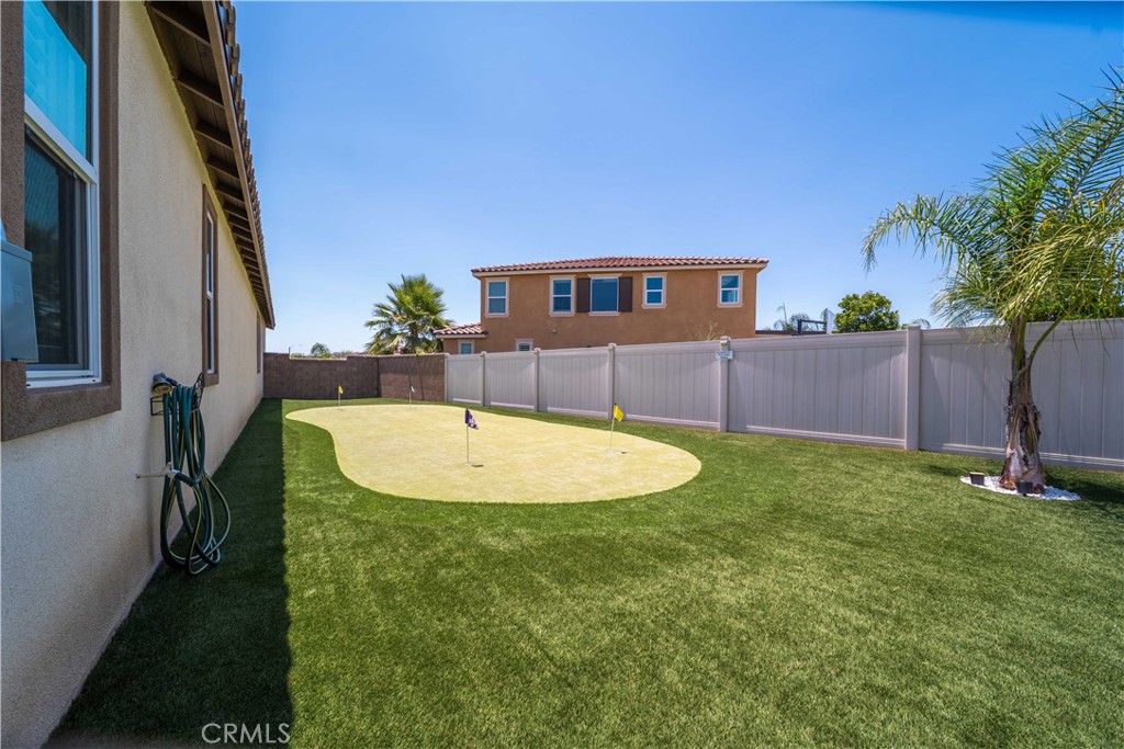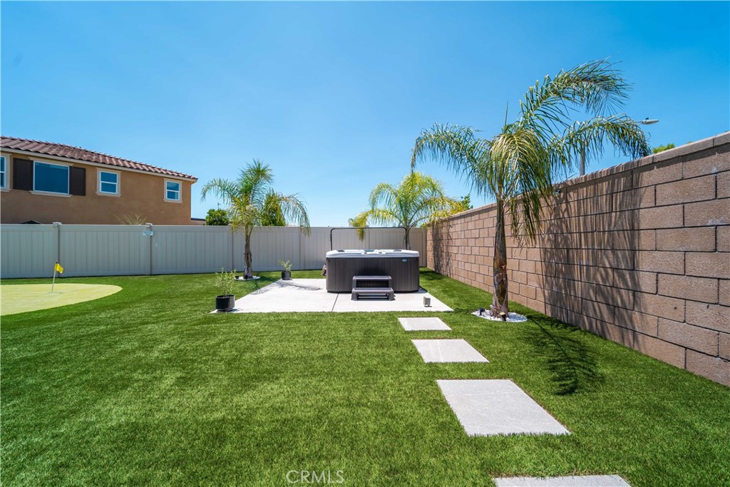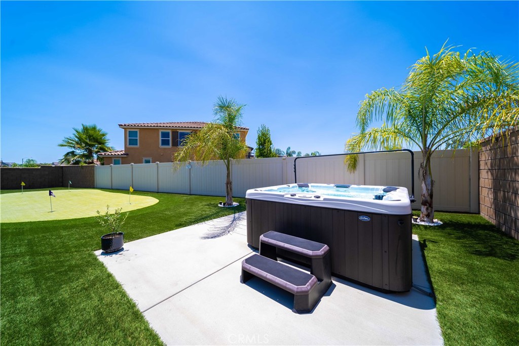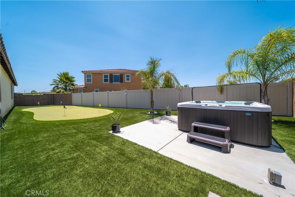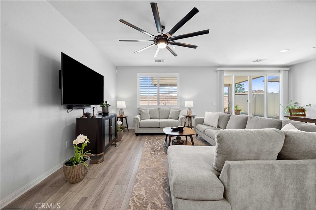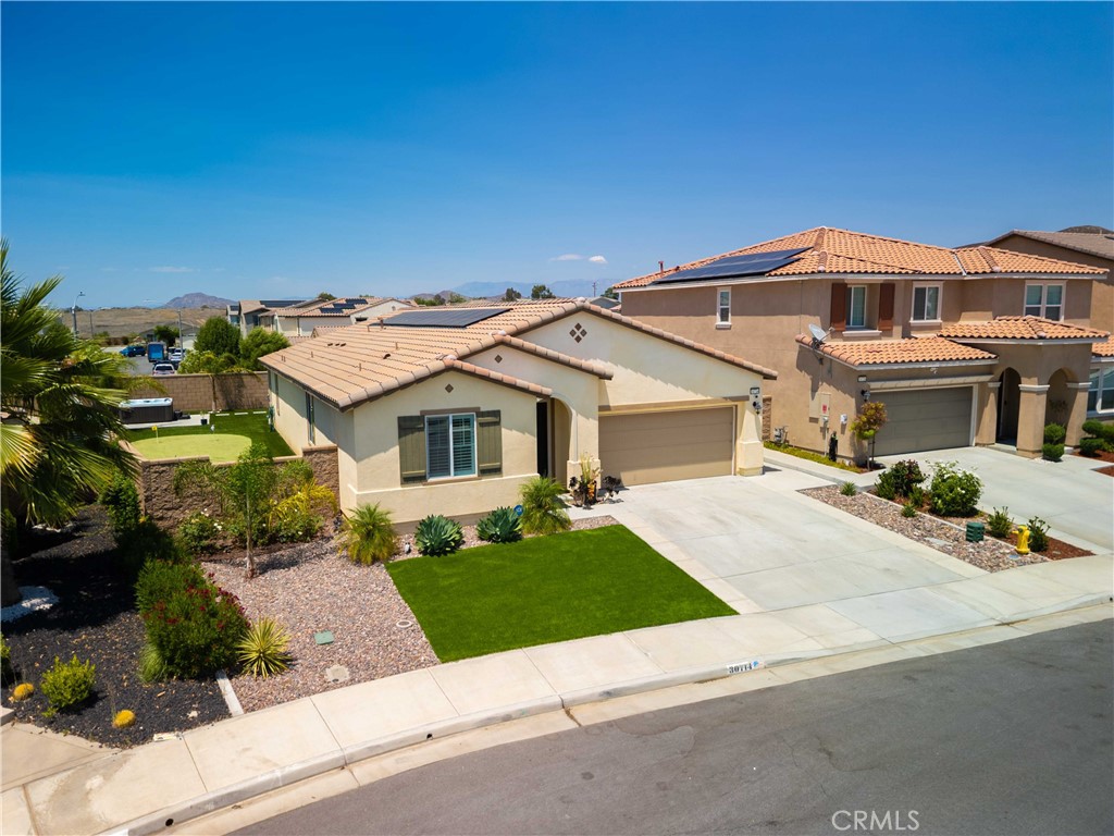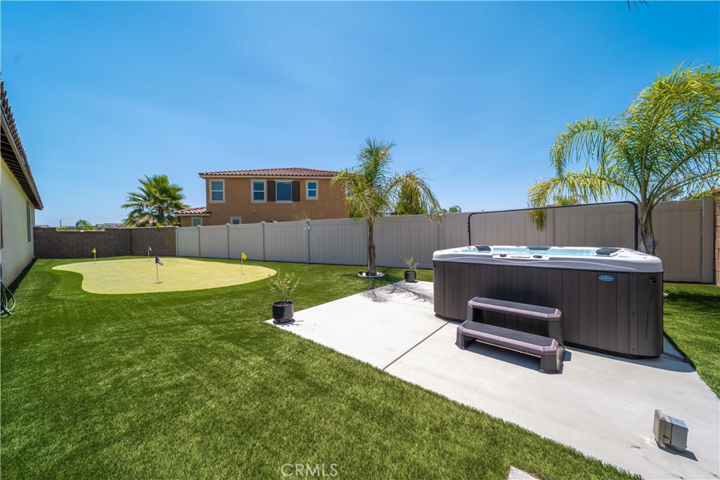 Welcome to this beautifully upgraded single-story home tucked within the highly sought-after Spencer's Crossing community. Offering 3 spacious bedrooms, 2 bathrooms, and over 2,000 square feet of open and functional living space, this home is designed for modern comfort and effortless entertaining. From the moment you step inside, you'll appreciate the inviting atmosphere created by wide-plank luxury vinyl flooring, plantation shutters throughout, recessed lighting, and an abundance of natural light. The two front bedrooms are thoughtfully positioned with a shared bathroom in between, providing both separation and privacy. A versatile bonus room is ideal for a home office, playroom, fitness studio, or even a potential 4th bedroom. The heart of the home features an expansive great room that flows seamlessly into the chef's kitchen, complete with warm espresso cabinetry, granite countertops, stainless steel appliances, pendant lighting, and a large center island with breakfast bar seating. The living room's oversized ceiling fan and neutral color palette enhance the space's relaxed, yet refined style. Privately located at the rear of the home, the primary suite serves as a peaceful retreat with an ensuite bath featuring dual vanities, an oversized step-in shower, and a large walk-in closet. Step outside to your own backyard oasis, where a newly installed Alumawood patio cover provides shade over the entertaining area, and a brand-new spa is surrounded by tropical landscaping and solar accent lighting--perfect for unwinding in the evenings. A custom putting green, low-maintenance turf, and concrete hardscape make this backyard both functional and resort-like. The front yard also features artificial turf, enhancing curb appeal and minimizing upkeep. Additional highlights include a paid-off solar system, whole-house water filtration, and new epoxy flooring in the garage. Located just minutes from the 215 freeway, top-rated schools, and premier community amenities--including pools, parks, trails, and sports courts--this turn-key property combines comfort, style, and convenience in one exceptional home.