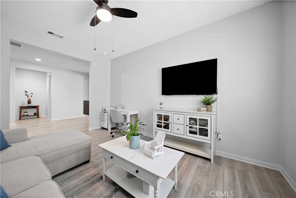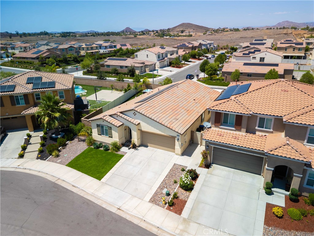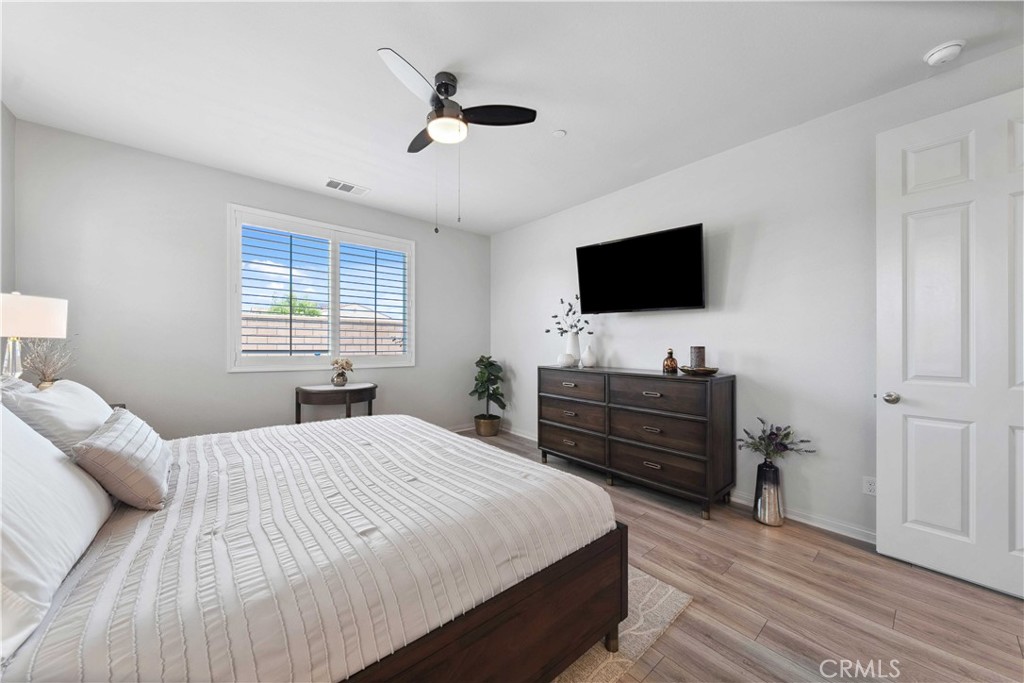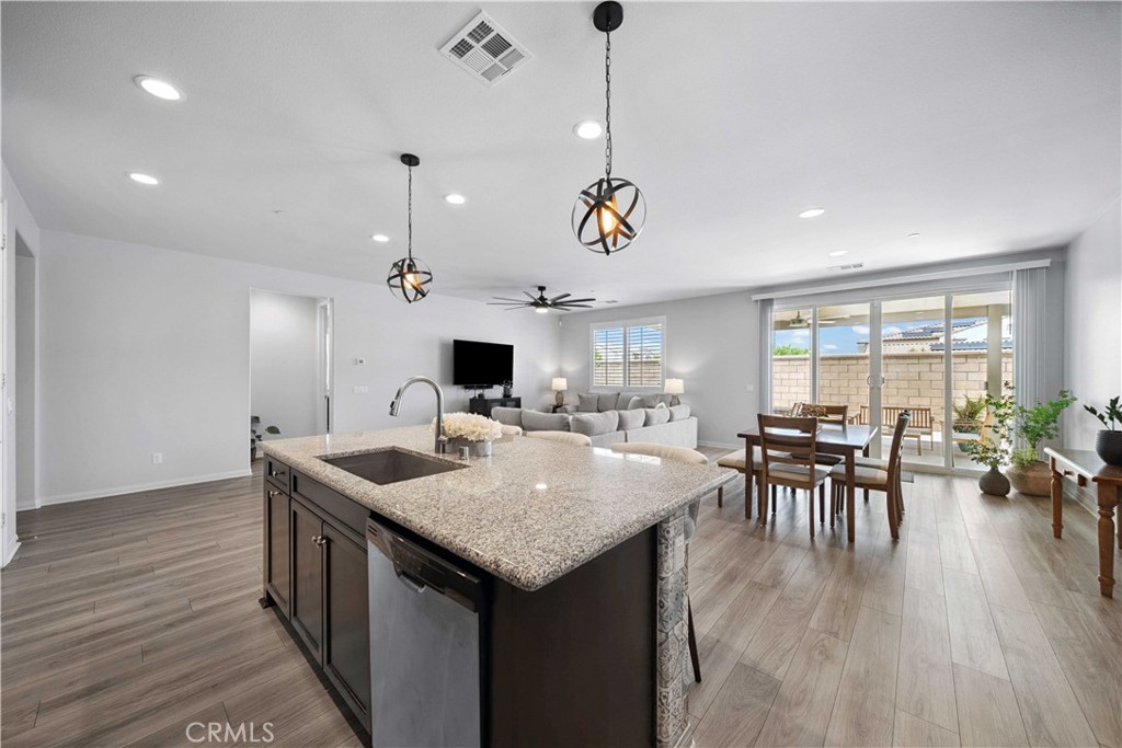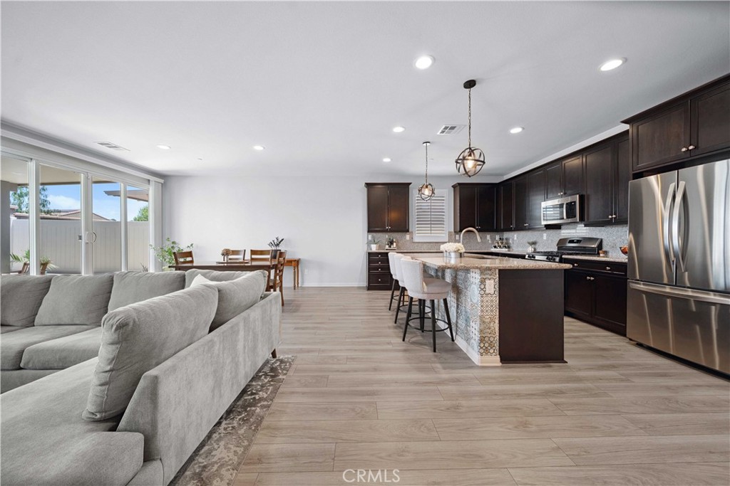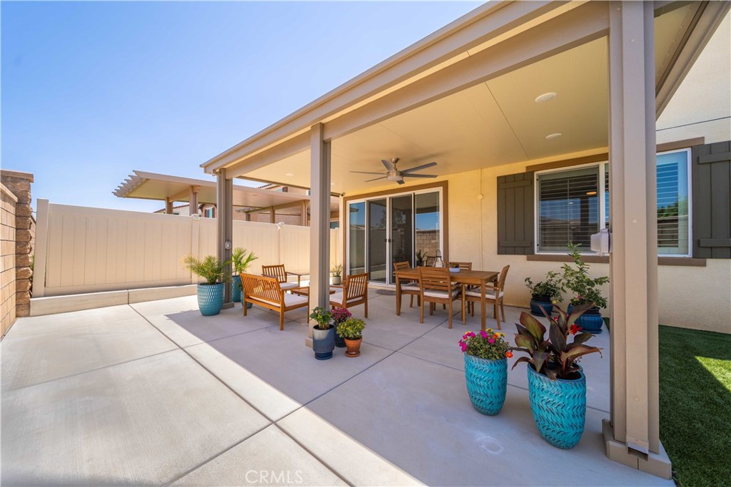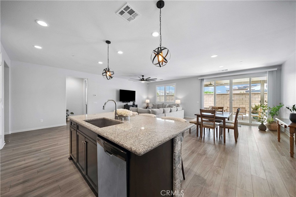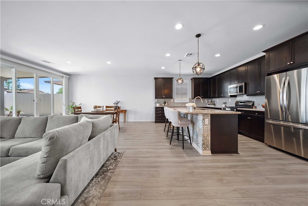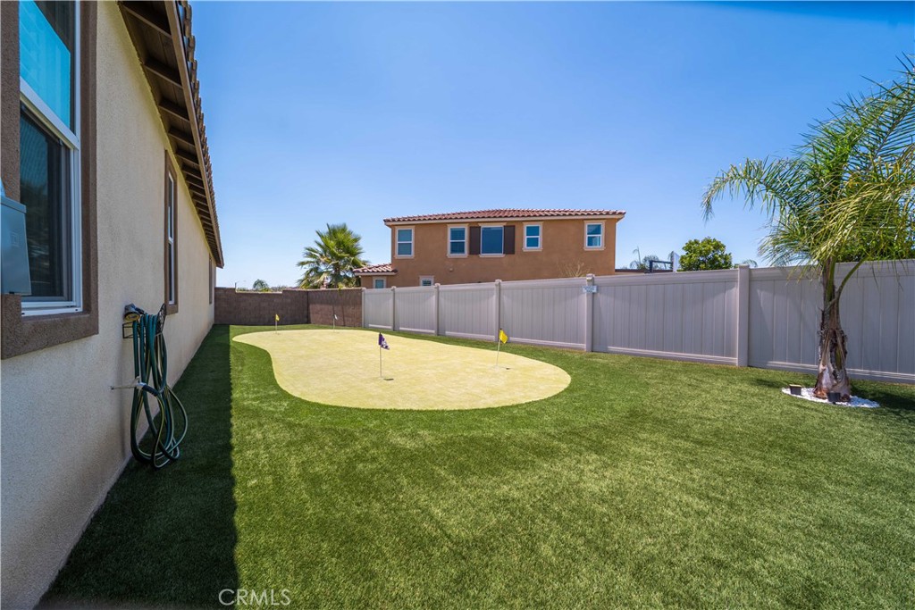 Welcome to this beautifully upgraded single-story home tucked within the highly sought-after Spencer's Crossing community. Offering 3 spacious bedrooms, 2 bathrooms, and over 2,000 square feet of open and functional living space, this home is designed for modern comfort and effortless entertaining. From the moment you step inside, you'll appreciate the inviting atmosphere created by wide-plank luxury vinyl flooring, plantation shutters throughout, recessed lighting, and an abundance of natural light. The two front bedrooms are thoughtfully positioned with a shared bathroom in between, providing both separation and privacy. A versatile bonus room is ideal for a home office, playroom, fitness studio, or even a potential 4th bedroom. The heart of the home features an expansive great room that flows seamlessly into the chef's kitchen, complete with warm espresso cabinetry, granite countertops, stainless steel appliances, pendant lighting, and a large center island with breakfast bar seating. The living room's oversized ceiling fan and neutral color palette enhance the space's relaxed, yet refined style. Privately located at the rear of the home, the primary suite serves as a peaceful retreat with an ensuite bath featuring dual vanities, an oversized step-in shower, and a large walk-in closet. Step outside to your own backyard oasis, where a newly installed Alumawood patio cover provides shade over the entertaining area, and a brand-new spa is surrounded by tropical landscaping and solar accent lighting--perfect for unwinding in the evenings. A custom putting green, low-maintenance turf, and concrete hardscape make this backyard both functional and resort-like. The front yard also features artificial turf, enhancing curb appeal and minimizing upkeep. Additional highlights include a paid-off solar system, whole-house water filtration, and new epoxy flooring in the garage. Located just minutes from the 215 freeway, top-rated schools, and premier community amenities--including pools, parks, trails, and sports courts--this turn-key property combines comfort, style, and convenience in one exceptional home.