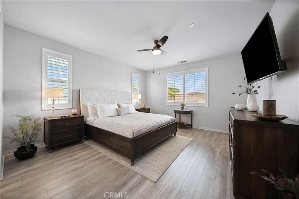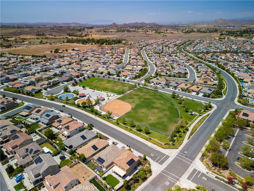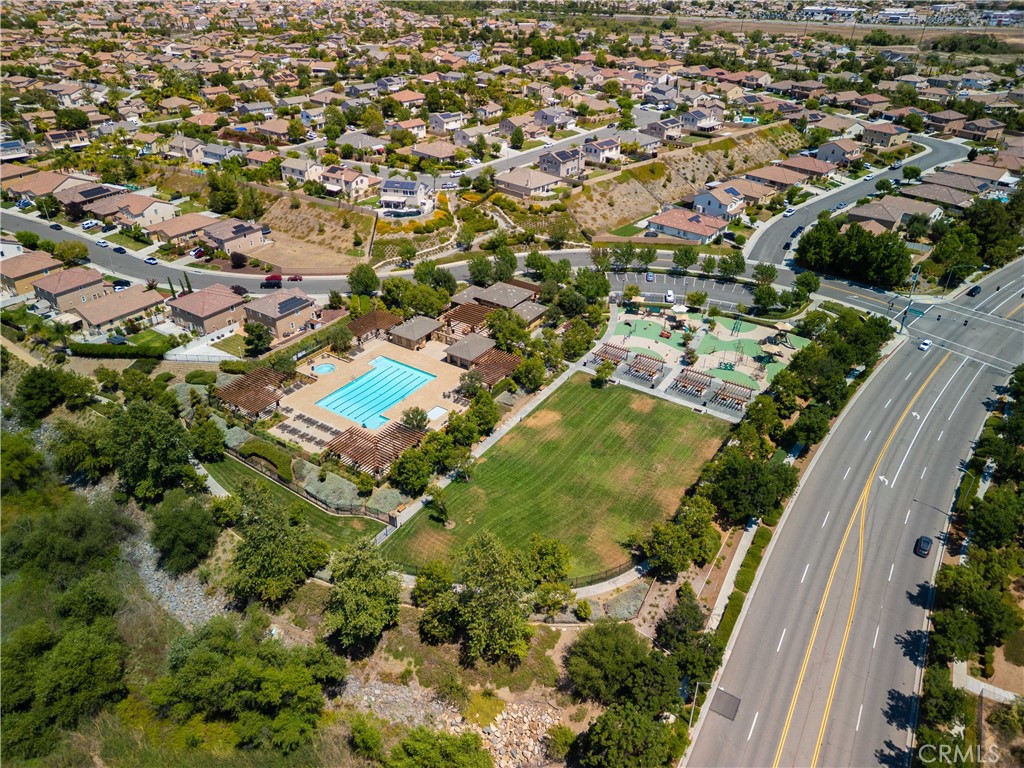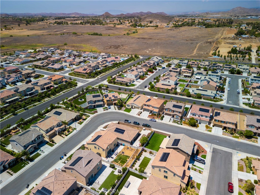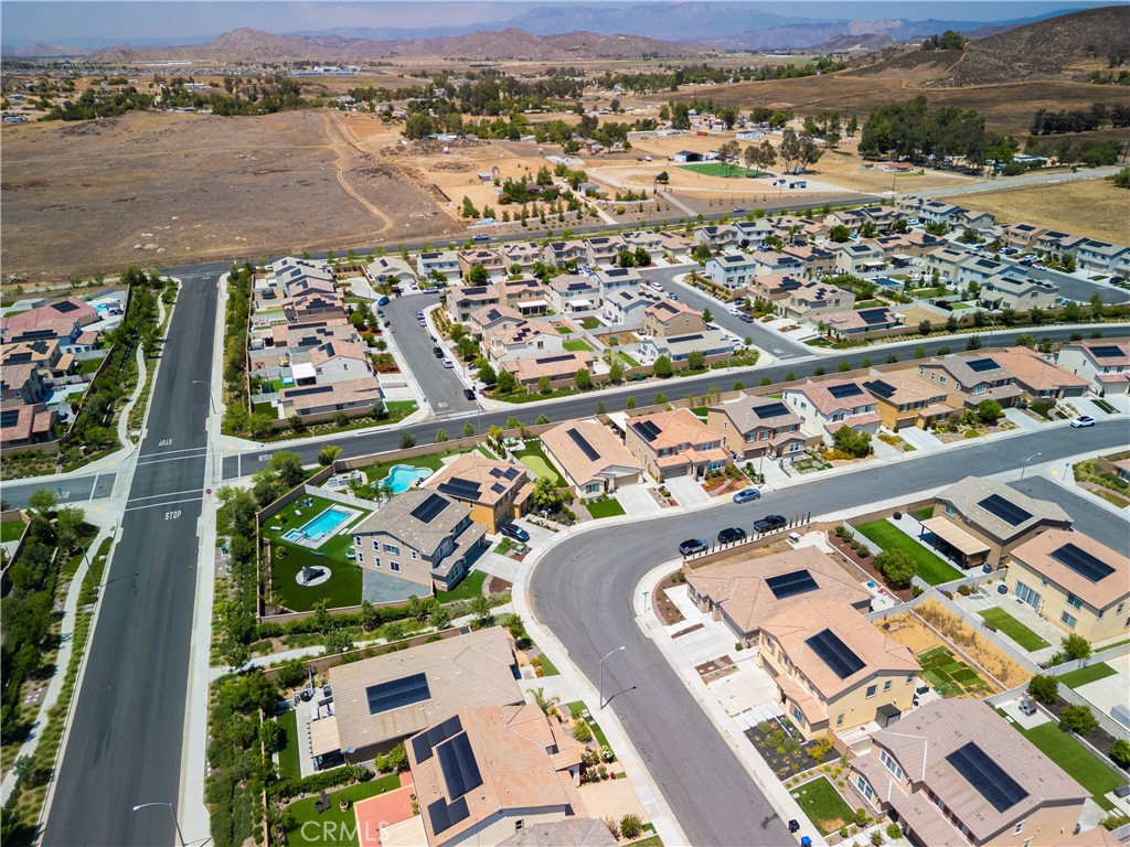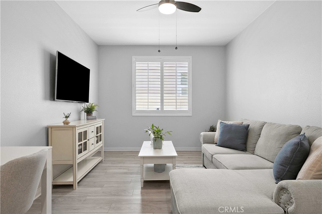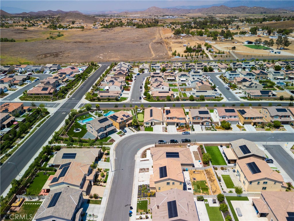 Welcome to this beautifully upgraded single-story home tucked within the highly sought-after Spencer's Crossing community. Offering 3 spacious bedrooms, 2 bathrooms, and over 2,000 square feet of open and functional living space, this home is designed for modern comfort and effortless entertaining. From the moment you step inside, you'll appreciate the inviting atmosphere created by wide-plank luxury vinyl flooring, plantation shutters throughout, recessed lighting, and an abundance of natural light. The two front bedrooms are thoughtfully positioned with a shared bathroom in between, providing both separation and privacy. A versatile bonus room is ideal for a home office, playroom, fitness studio, or even a potential 4th bedroom. The heart of the home features an expansive great room that flows seamlessly into the chef's kitchen, complete with warm espresso cabinetry, granite countertops, stainless steel appliances, pendant lighting, and a large center island with breakfast bar seating. The living room's oversized ceiling fan and neutral color palette enhance the space's relaxed, yet refined style. Privately located at the rear of the home, the primary suite serves as a peaceful retreat with an ensuite bath featuring dual vanities, an oversized step-in shower, and a large walk-in closet. Step outside to your own backyard oasis, where a newly installed Alumawood patio cover provides shade over the entertaining area, and a brand-new spa is surrounded by tropical landscaping and solar accent lighting--perfect for unwinding in the evenings. A custom putting green, low-maintenance turf, and concrete hardscape make this backyard both functional and resort-like. The front yard also features artificial turf, enhancing curb appeal and minimizing upkeep. Additional highlights include a paid-off solar system, whole-house water filtration, and new epoxy flooring in the garage. Located just minutes from the 215 freeway, top-rated schools, and premier community amenities--including pools, parks, trails, and sports courts--this turn-key property combines comfort, style, and convenience in one exceptional home.