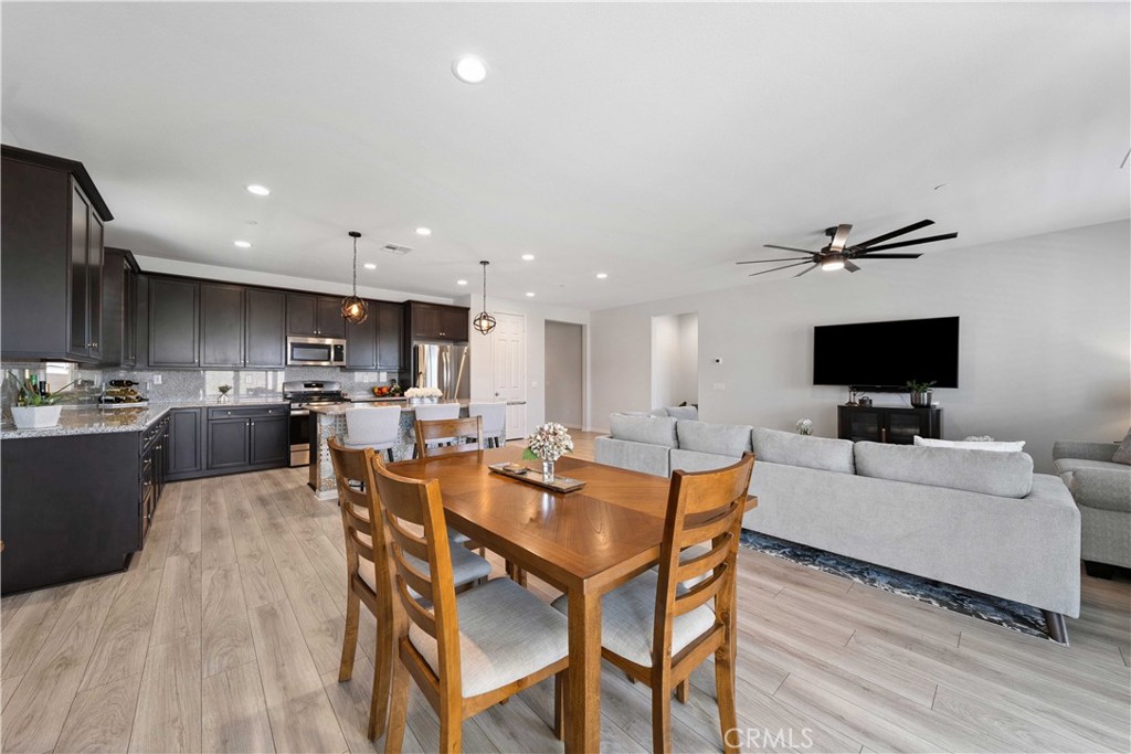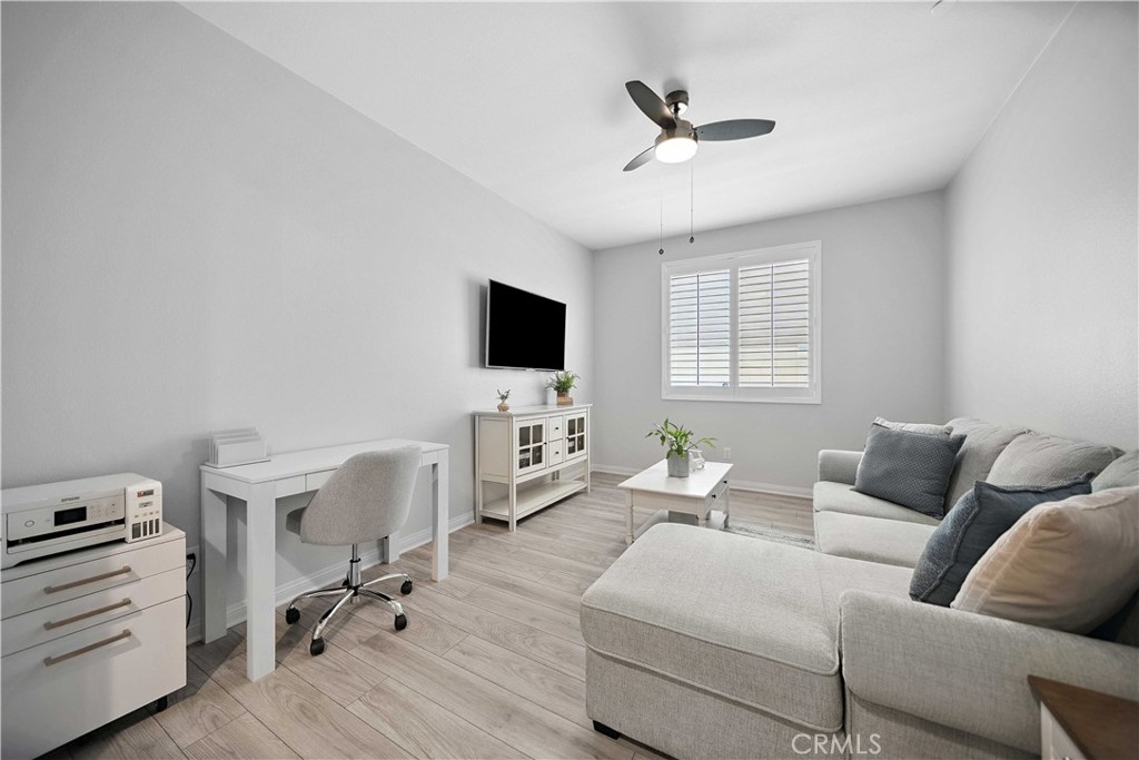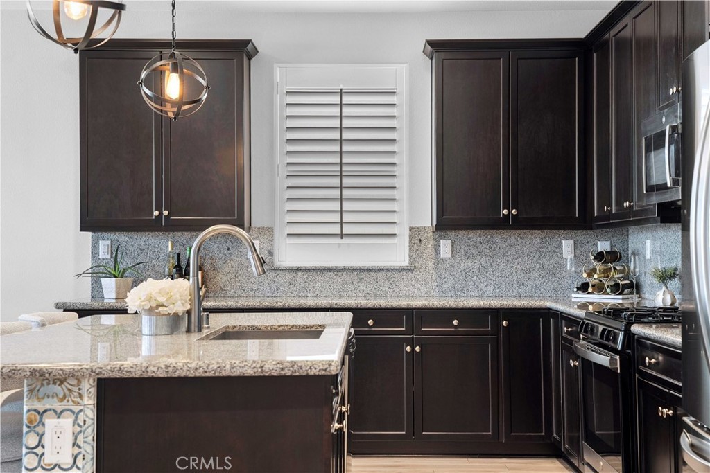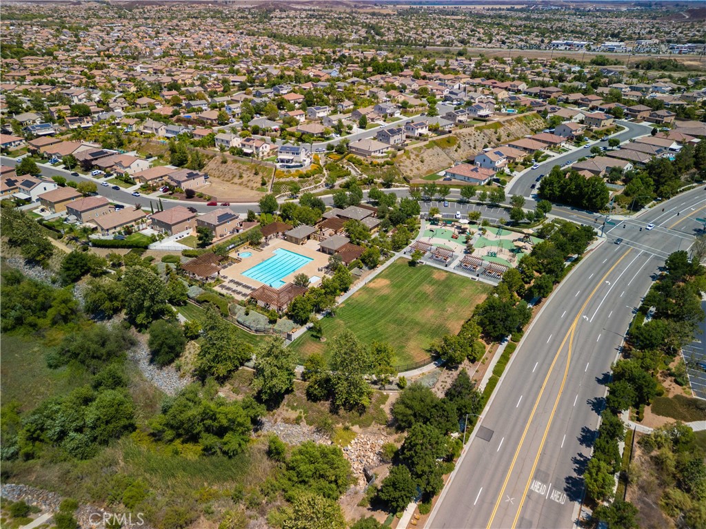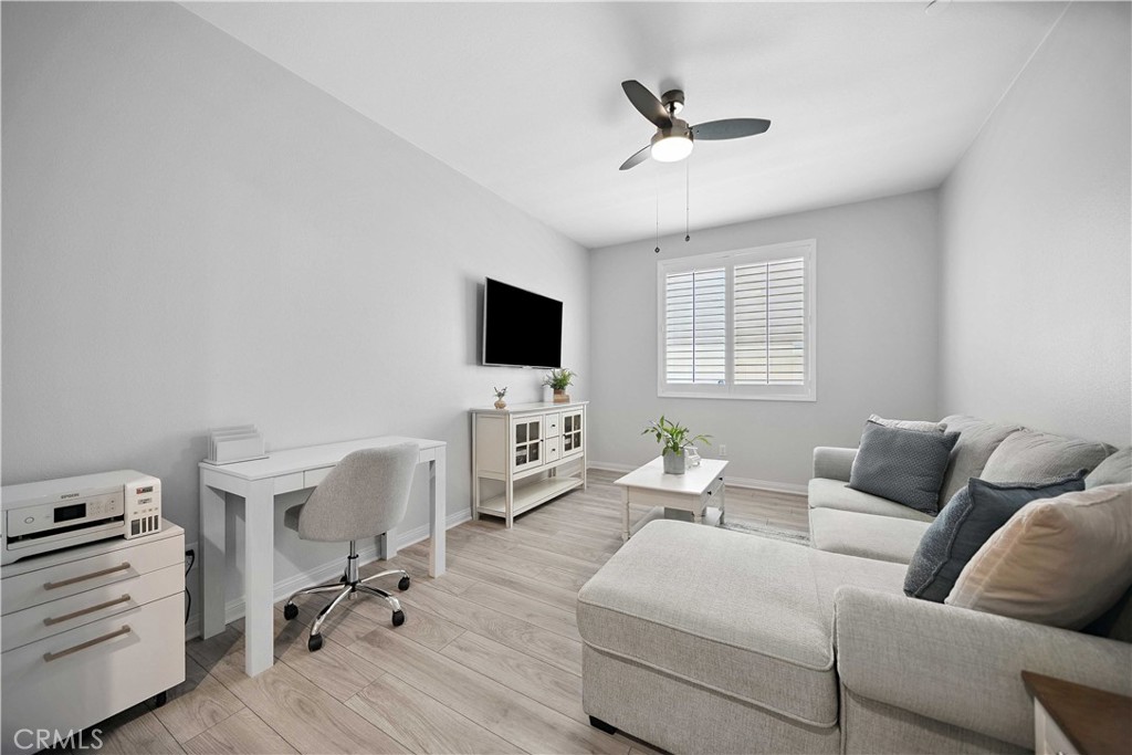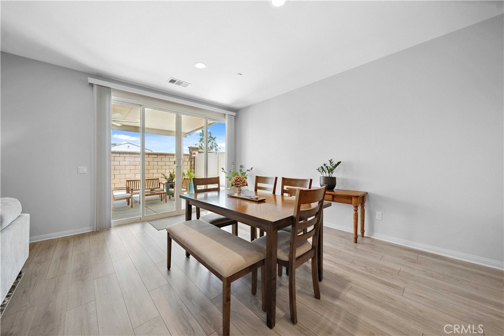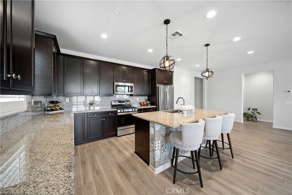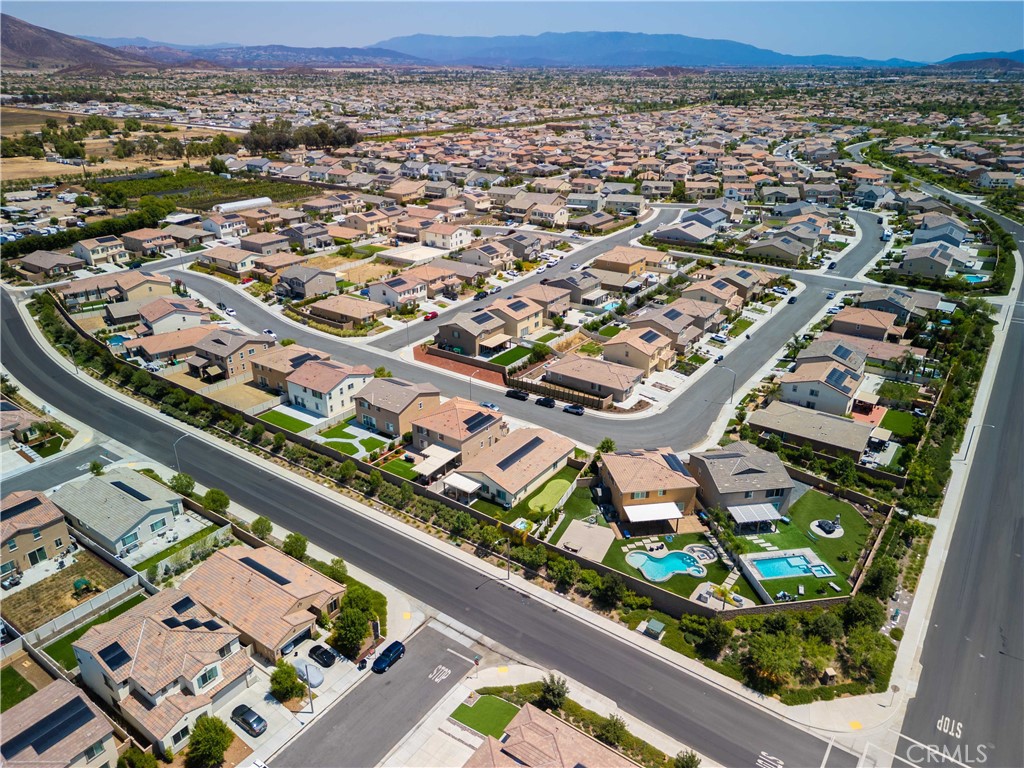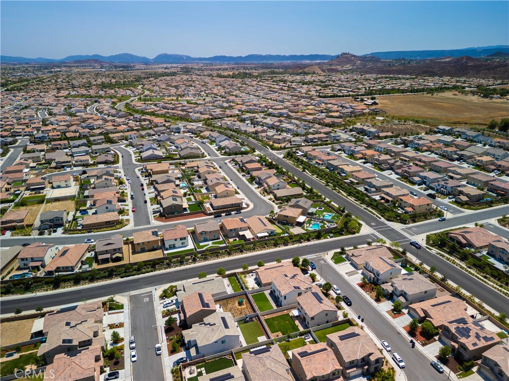 Welcome to this beautifully upgraded single-story home tucked within the highly sought-after Spencer's Crossing community. Offering 3 spacious bedrooms, 2 bathrooms, and over 2,000 square feet of open and functional living space, this home is designed for modern comfort and effortless entertaining. From the moment you step inside, you'll appreciate the inviting atmosphere created by wide-plank luxury vinyl flooring, plantation shutters throughout, recessed lighting, and an abundance of natural light. The two front bedrooms are thoughtfully positioned with a shared bathroom in between, providing both separation and privacy. A versatile bonus room is ideal for a home office, playroom, fitness studio, or even a potential 4th bedroom. The heart of the home features an expansive great room that flows seamlessly into the chef's kitchen, complete with warm espresso cabinetry, granite countertops, stainless steel appliances, pendant lighting, and a large center island with breakfast bar seating. The living room's oversized ceiling fan and neutral color palette enhance the space's relaxed, yet refined style. Privately located at the rear of the home, the primary suite serves as a peaceful retreat with an ensuite bath featuring dual vanities, an oversized step-in shower, and a large walk-in closet. Step outside to your own backyard oasis, where a newly installed Alumawood patio cover provides shade over the entertaining area, and a brand-new spa is surrounded by tropical landscaping and solar accent lighting--perfect for unwinding in the evenings. A custom putting green, low-maintenance turf, and concrete hardscape make this backyard both functional and resort-like. The front yard also features artificial turf, enhancing curb appeal and minimizing upkeep. Additional highlights include a paid-off solar system, whole-house water filtration, and new epoxy flooring in the garage. Located just minutes from the 215 freeway, top-rated schools, and premier community amenities--including pools, parks, trails, and sports courts--this turn-key property combines comfort, style, and convenience in one exceptional home.