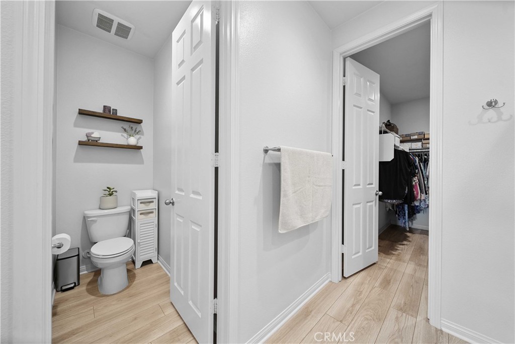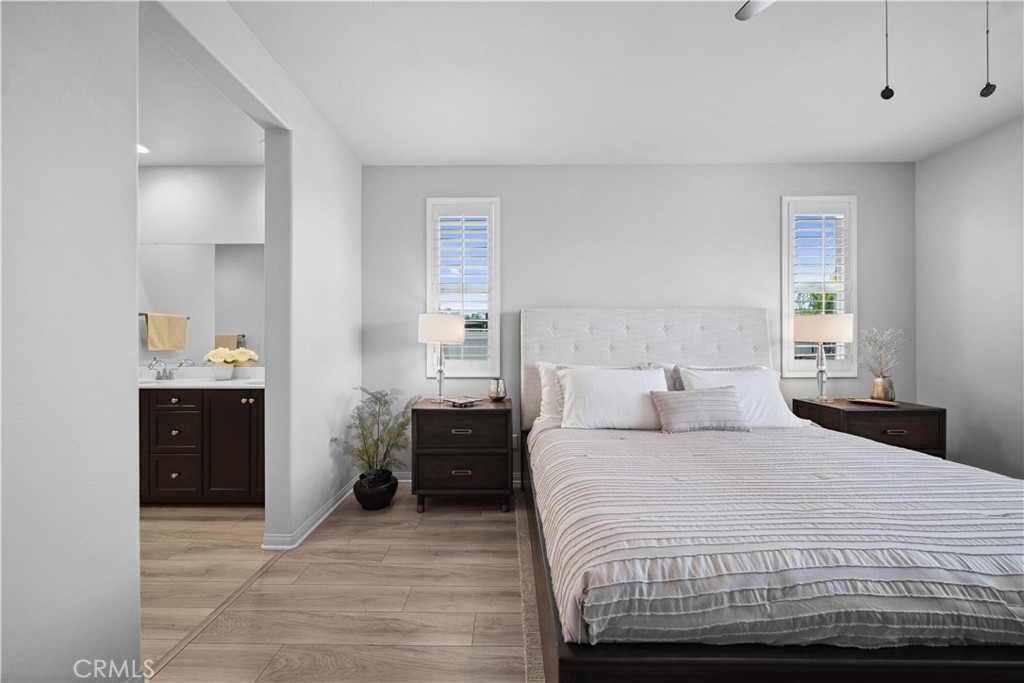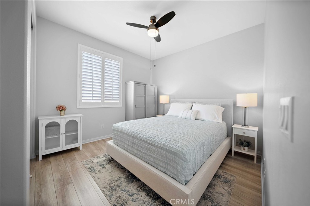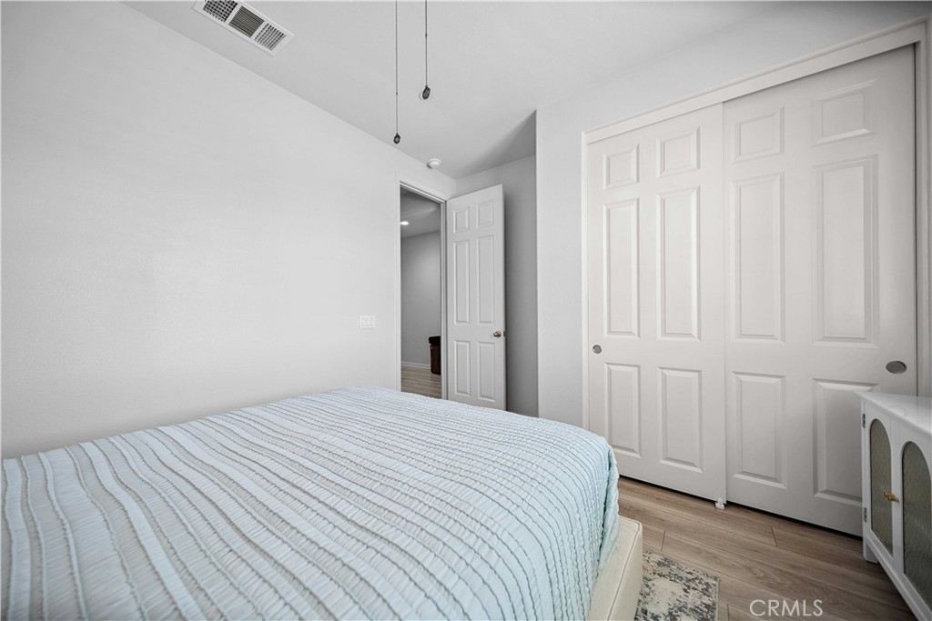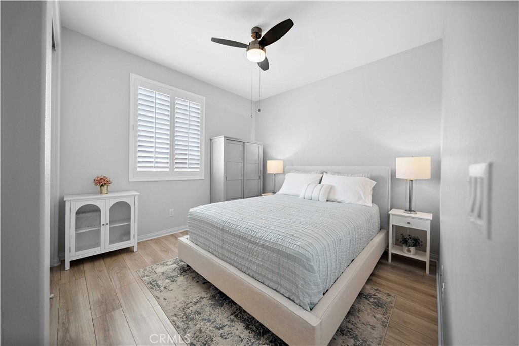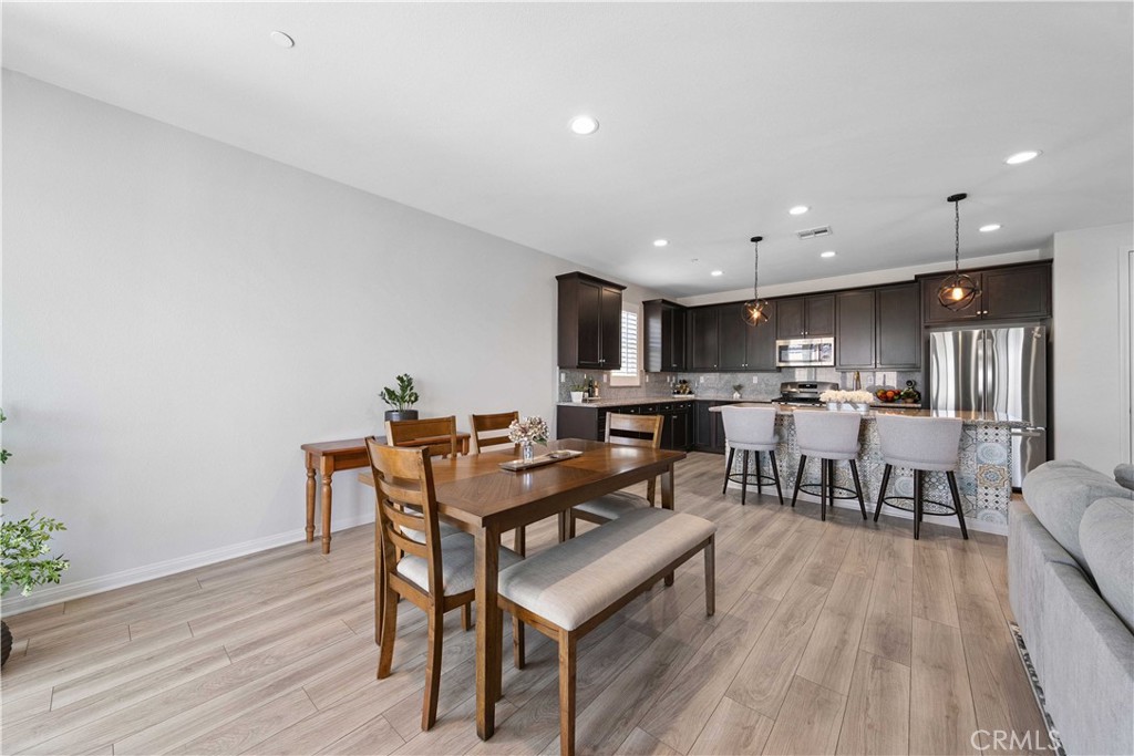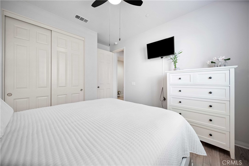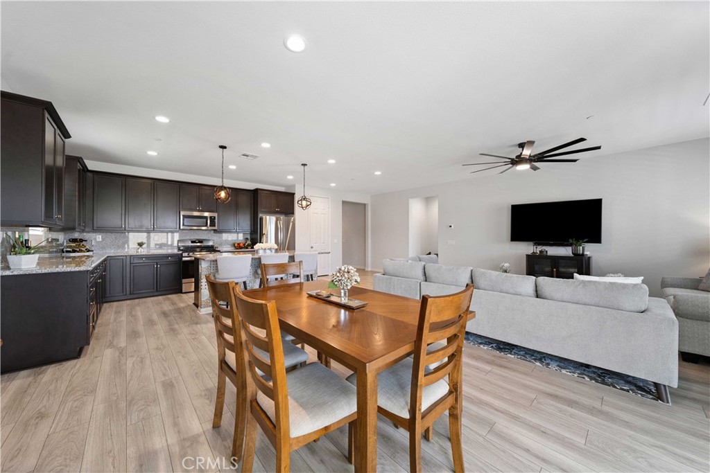 Welcome to this beautifully upgraded single-story home tucked within the highly sought-after Spencer's Crossing community. Offering 3 spacious bedrooms, 2 bathrooms, and over 2,000 square feet of open and functional living space, this home is designed for modern comfort and effortless entertaining. From the moment you step inside, you'll appreciate the inviting atmosphere created by wide-plank luxury vinyl flooring, plantation shutters throughout, recessed lighting, and an abundance of natural light. The two front bedrooms are thoughtfully positioned with a shared bathroom in between, providing both separation and privacy. A versatile bonus room is ideal for a home office, playroom, fitness studio, or even a potential 4th bedroom. The heart of the home features an expansive great room that flows seamlessly into the chef's kitchen, complete with warm espresso cabinetry, granite countertops, stainless steel appliances, pendant lighting, and a large center island with breakfast bar seating. The living room's oversized ceiling fan and neutral color palette enhance the space's relaxed, yet refined style. Privately located at the rear of the home, the primary suite serves as a peaceful retreat with an ensuite bath featuring dual vanities, an oversized step-in shower, and a large walk-in closet. Step outside to your own backyard oasis, where a newly installed Alumawood patio cover provides shade over the entertaining area, and a brand-new spa is surrounded by tropical landscaping and solar accent lighting--perfect for unwinding in the evenings. A custom putting green, low-maintenance turf, and concrete hardscape make this backyard both functional and resort-like. The front yard also features artificial turf, enhancing curb appeal and minimizing upkeep. Additional highlights include a paid-off solar system, whole-house water filtration, and new epoxy flooring in the garage. Located just minutes from the 215 freeway, top-rated schools, and premier community amenities--including pools, parks, trails, and sports courts--this turn-key property combines comfort, style, and convenience in one exceptional home.