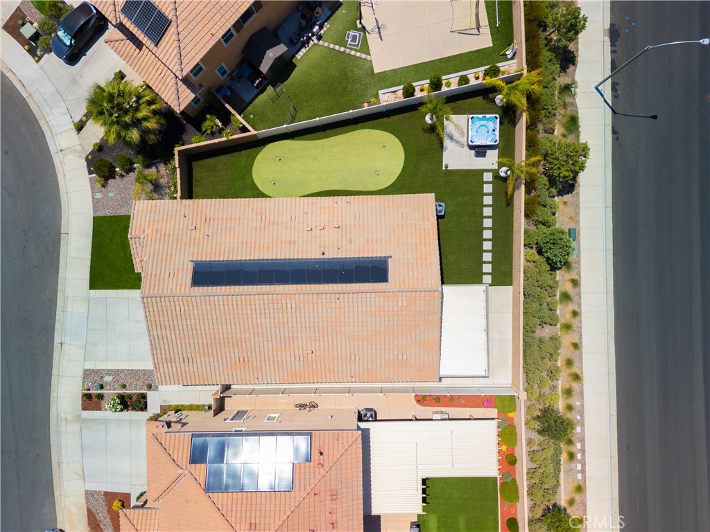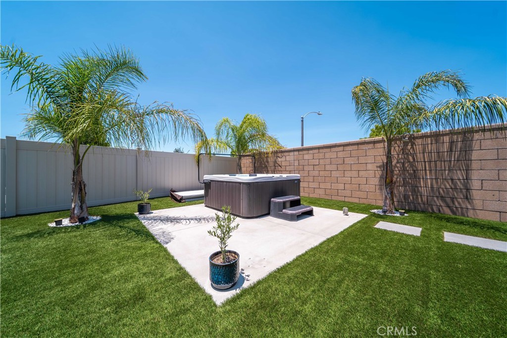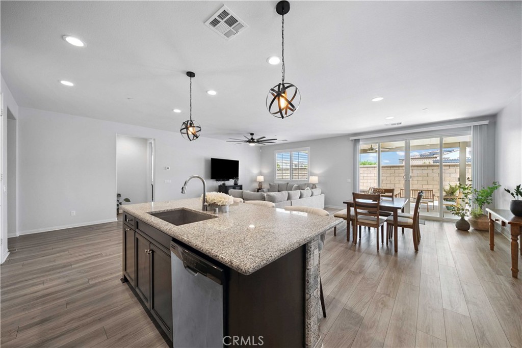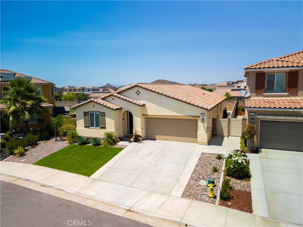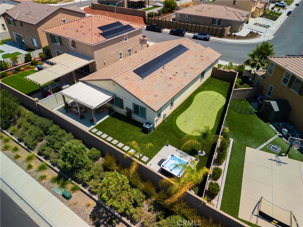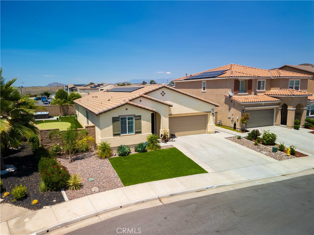 Welcome to this beautifully upgraded single-story home tucked within the highly sought-after Spencer's Crossing community. Offering 3 spacious bedrooms, 2 bathrooms, and over 2,000 square feet of open and functional living space, this home is designed for modern comfort and effortless entertaining. From the moment you step inside, you'll appreciate the inviting atmosphere created by wide-plank luxury vinyl flooring, plantation shutters throughout, recessed lighting, and an abundance of natural light. The two front bedrooms are thoughtfully positioned with a shared bathroom in between, providing both separation and privacy. A versatile bonus room is ideal for a home office, playroom, fitness studio, or even a potential 4th bedroom. The heart of the home features an expansive great room that flows seamlessly into the chef's kitchen, complete with warm espresso cabinetry, granite countertops, stainless steel appliances, pendant lighting, and a large center island with breakfast bar seating. The living room's oversized ceiling fan and neutral color palette enhance the space's relaxed, yet refined style. Privately located at the rear of the home, the primary suite serves as a peaceful retreat with an ensuite bath featuring dual vanities, an oversized step-in shower, and a large walk-in closet. Step outside to your own backyard oasis, where a newly installed Alumawood patio cover provides shade over the entertaining area, and a brand-new spa is surrounded by tropical landscaping and solar accent lighting--perfect for unwinding in the evenings. A custom putting green, low-maintenance turf, and concrete hardscape make this backyard both functional and resort-like. The front yard also features artificial turf, enhancing curb appeal and minimizing upkeep. Additional highlights include a paid-off solar system and new epoxy flooring in the garage. Located just minutes from the 215 freeway, top-rated schools, and premier community amenities--including pools, parks, trails, and sports courts--this turn-key property combines comfort, style, and convenience in one exceptional home.
