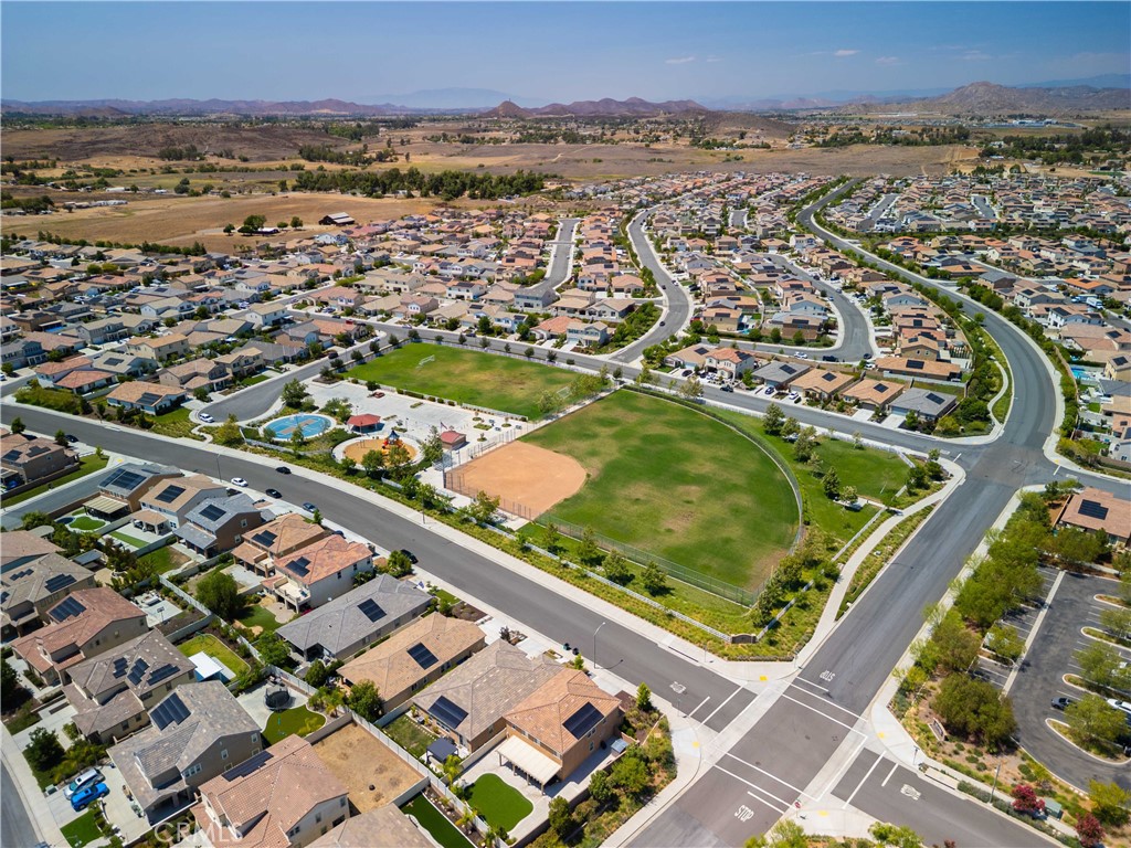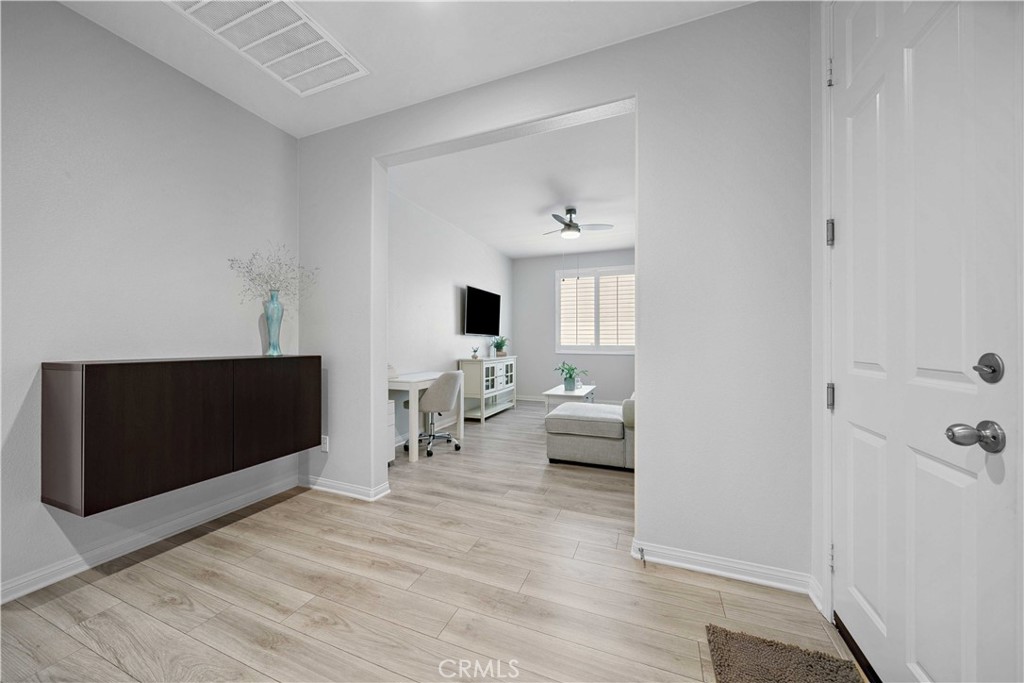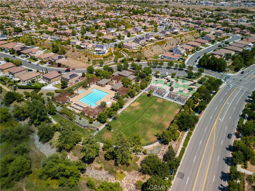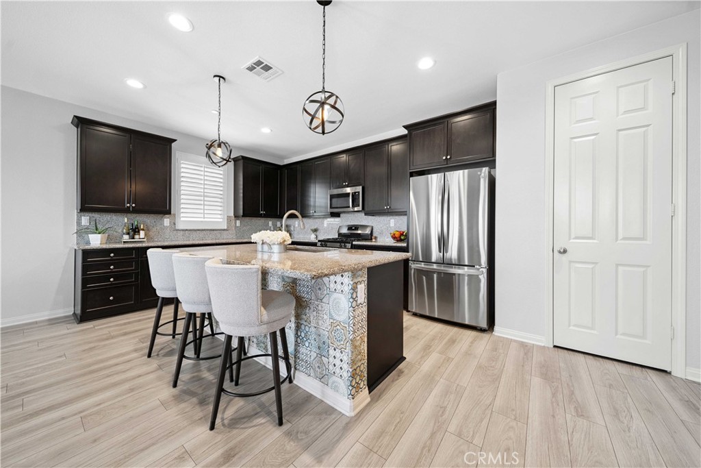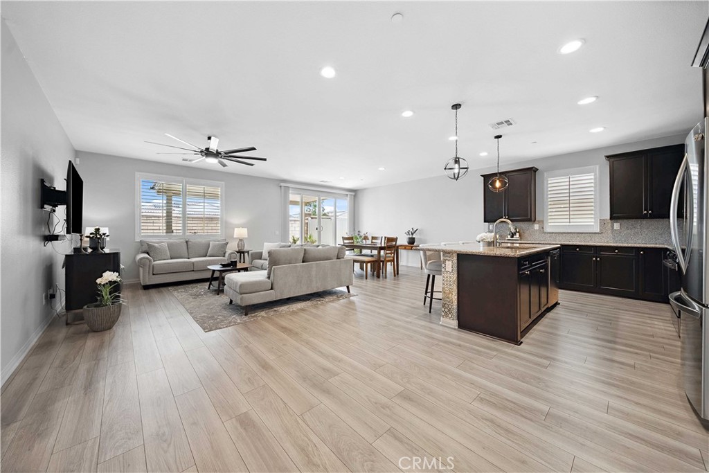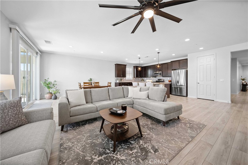 Welcome to this beautifully upgraded single-story home tucked within the highly sought-after Spencer's Crossing community. Offering 3 spacious bedrooms, 2 bathrooms, and over 2,000 square feet of open and functional living space, this home is designed for modern comfort and effortless entertaining. From the moment you step inside, you'll appreciate the inviting atmosphere created by wide-plank luxury vinyl flooring, plantation shutters throughout, recessed lighting, and an abundance of natural light. The two front bedrooms are thoughtfully positioned with a shared bathroom in between, providing both separation and privacy. A versatile bonus room is ideal for a home office, playroom, fitness studio, or even a potential 4th bedroom. The heart of the home features an expansive great room that flows seamlessly into the chef's kitchen, complete with warm espresso cabinetry, granite countertops, stainless steel appliances, pendant lighting, and a large center island with breakfast bar seating. The living room's oversized ceiling fan and neutral color palette enhance the space's relaxed, yet refined style. Privately located at the rear of the home, the primary suite serves as a peaceful retreat with an ensuite bath featuring dual vanities, an oversized step-in shower, and a large walk-in closet. Step outside to your own backyard oasis, where a newly installed Alumawood patio cover provides shade over the entertaining area, and a brand-new spa is surrounded by tropical landscaping and solar accent lighting--perfect for unwinding in the evenings. A custom putting green, low-maintenance turf, and concrete hardscape make this backyard both functional and resort-like. The front yard also features artificial turf, enhancing curb appeal and minimizing upkeep. Additional highlights include a paid-off solar system and new epoxy flooring in the garage. Located just minutes from the 215 freeway, top-rated schools, and premier community amenities--including pools, parks, trails, and sports courts--this turn-key property combines comfort, style, and convenience in one exceptional home.