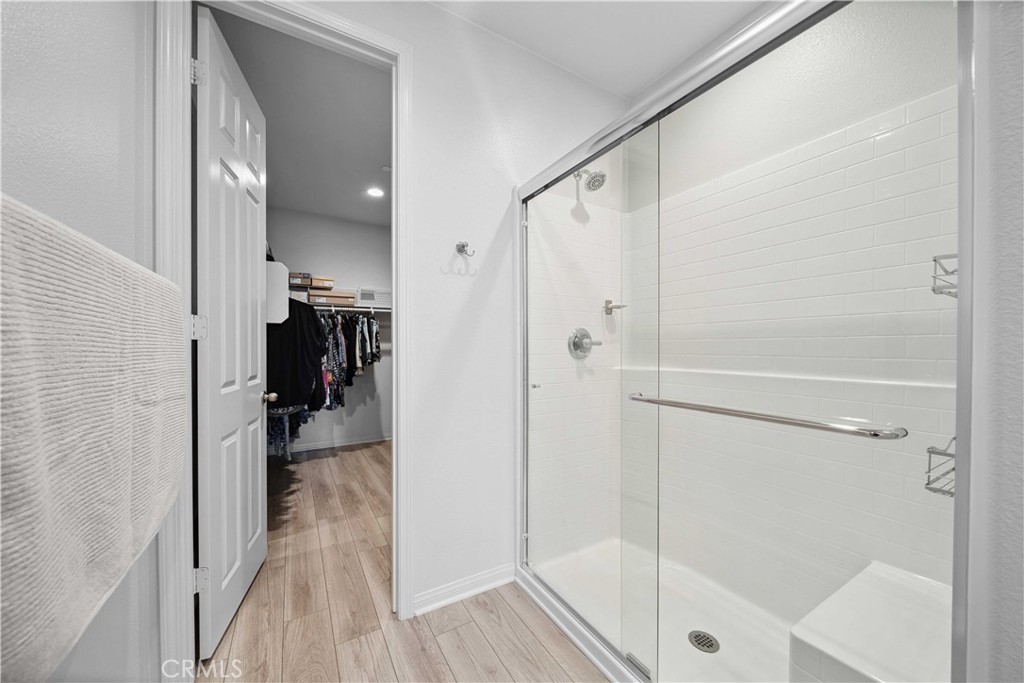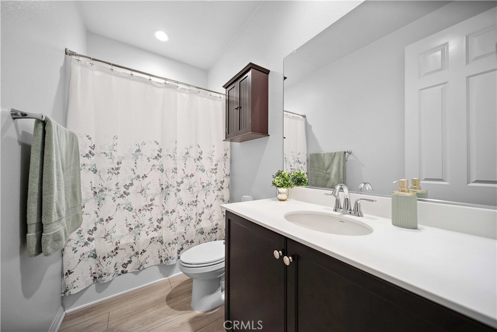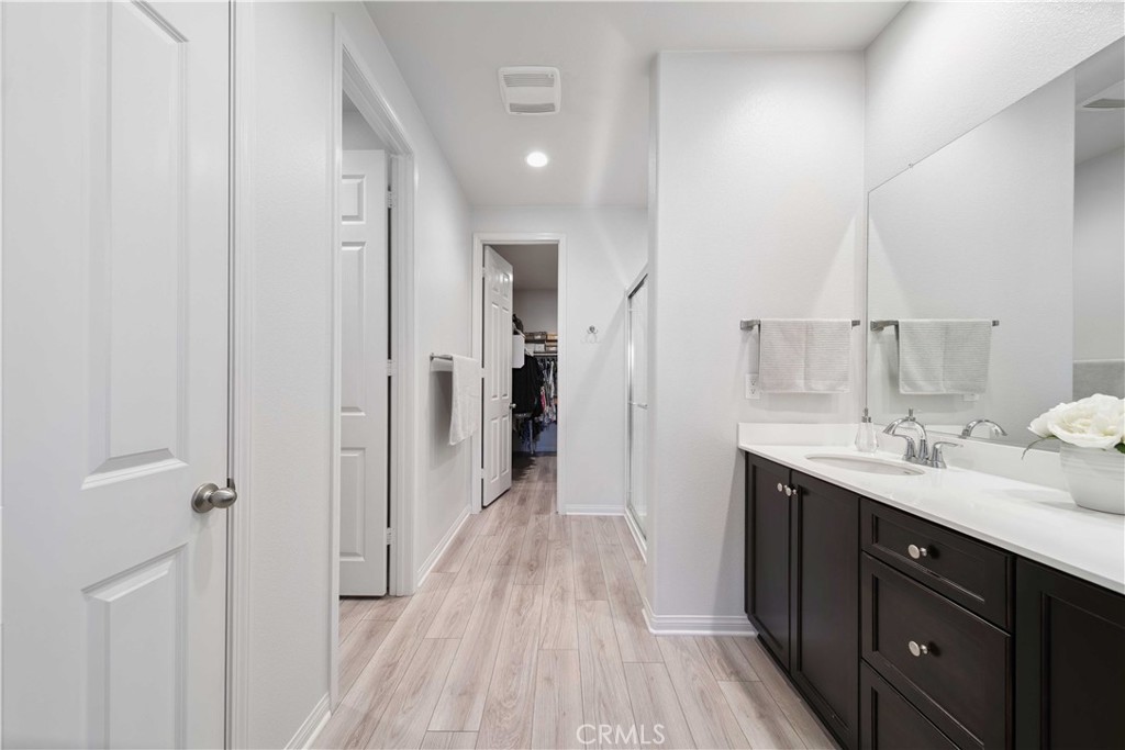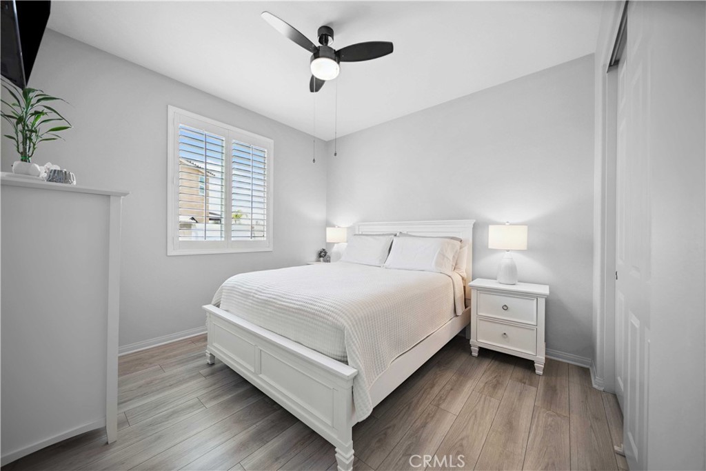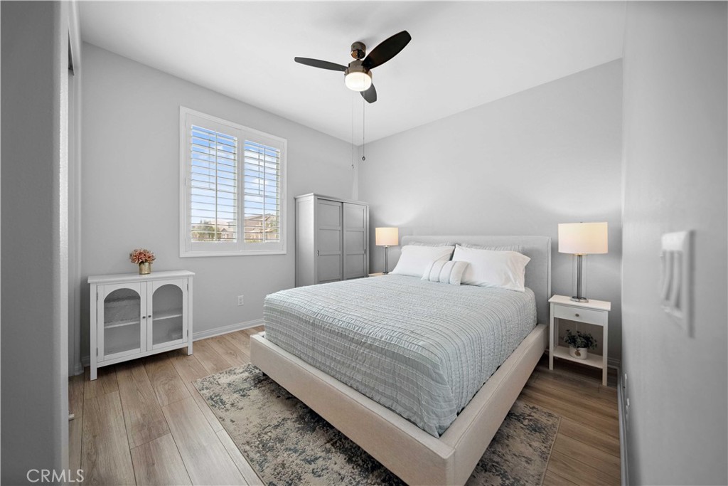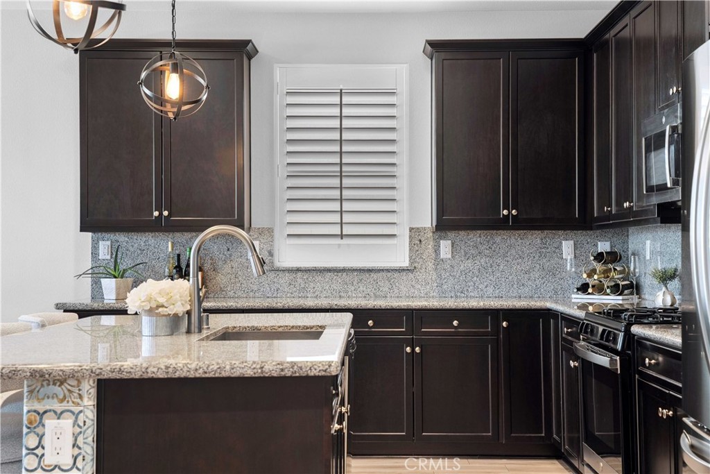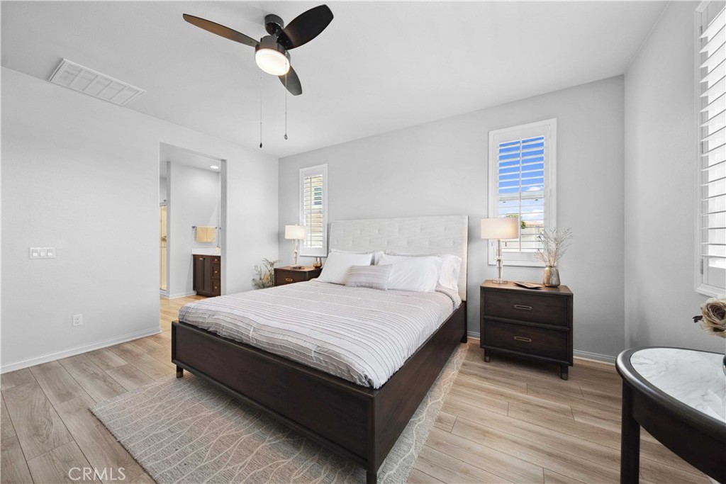 Welcome to this beautifully upgraded single-story home tucked within the highly sought-after Spencer's Crossing community. Offering 3 spacious bedrooms, 2 bathrooms, and over 2,000 square feet of open and functional living space, this home is designed for modern comfort and effortless entertaining. From the moment you step inside, you'll appreciate the inviting atmosphere created by wide-plank luxury vinyl flooring, plantation shutters throughout, recessed lighting, and an abundance of natural light. The two front bedrooms are thoughtfully positioned with a shared bathroom in between, providing both separation and privacy. A versatile bonus room is ideal for a home office, playroom, fitness studio, or even a potential 4th bedroom. The heart of the home features an expansive great room that flows seamlessly into the chef's kitchen, complete with warm espresso cabinetry, granite countertops, stainless steel appliances, pendant lighting, and a large center island with breakfast bar seating. The living room's oversized ceiling fan and neutral color palette enhance the space's relaxed, yet refined style. Privately located at the rear of the home, the primary suite serves as a peaceful retreat with an ensuite bath featuring dual vanities, an oversized step-in shower, and a large walk-in closet. Step outside to your own backyard oasis, where a newly installed Alumawood patio cover provides shade over the entertaining area, and a brand-new spa is surrounded by tropical landscaping and solar accent lighting--perfect for unwinding in the evenings. A custom putting green, low-maintenance turf, and concrete hardscape make this backyard both functional and resort-like. The front yard also features artificial turf, enhancing curb appeal and minimizing upkeep. Additional highlights include a paid-off solar system and new epoxy flooring in the garage. Located just minutes from the 215 freeway, top-rated schools, and premier community amenities--including pools, parks, trails, and sports courts--this turn-key property combines comfort, style, and convenience in one exceptional home.