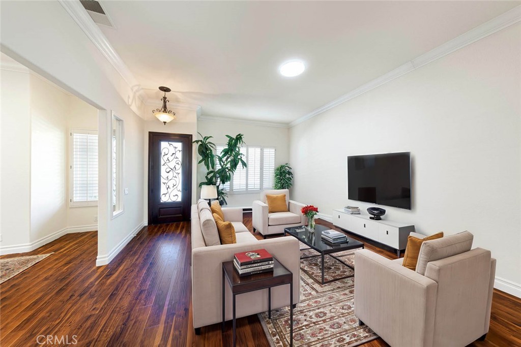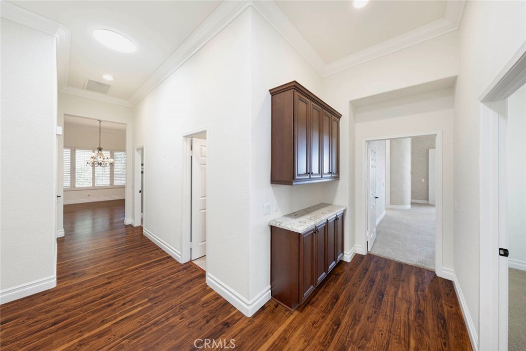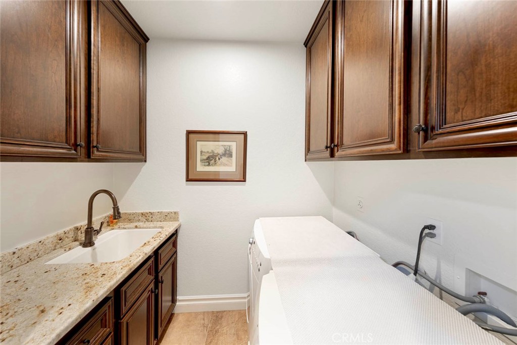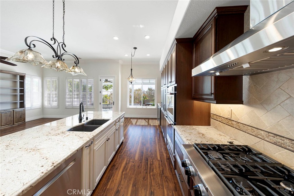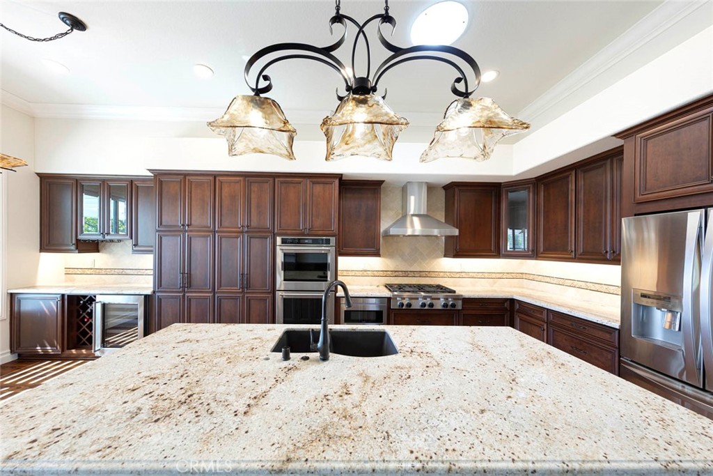 Step through the custom front door into an expansive living and dining area that seamlessly flows into the bright family room and gourmet kitchen. Designed for both comfort and style, the kitchen boasts an oversized granite island, newer stainless-steel appliances, custom pull-out cabinetry, double ovens, a 6-burner cooktop, a wine bar with built-in cooler, and a designer backsplash. Triple-pane windows and a sliding door lead to the backyard, where you'll enjoy panoramic views stretching to Catalina on clear days.