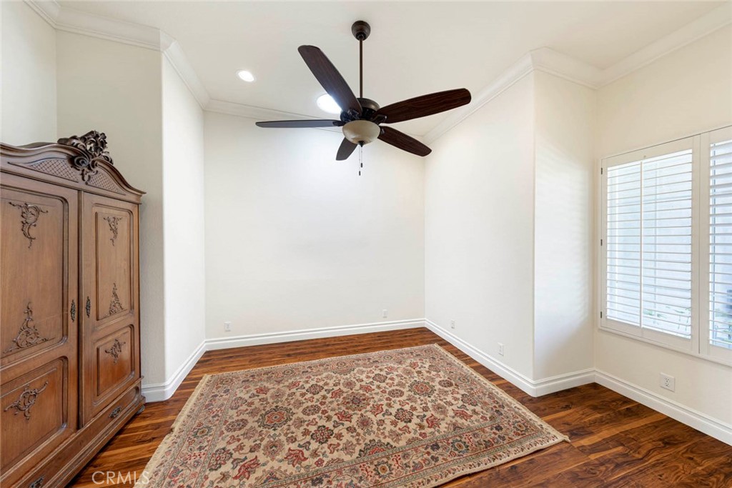Luxury flooring, plantation shutters, oversized baseboards, crown molding, and upgraded lighting enhance the home's sophisticated appeal. The spacious primary suite features, backyard access, a large walk-in closet, and a spa-like bathroom with a walk-in shower, soaking tub, and dual vanities. Two additional good size bedrooms with a 4th room presently being used as a home office/den.